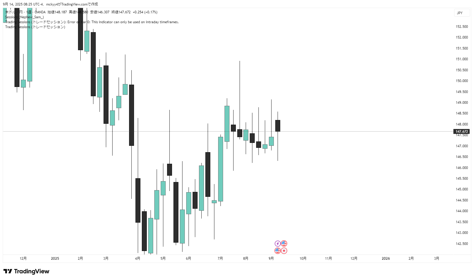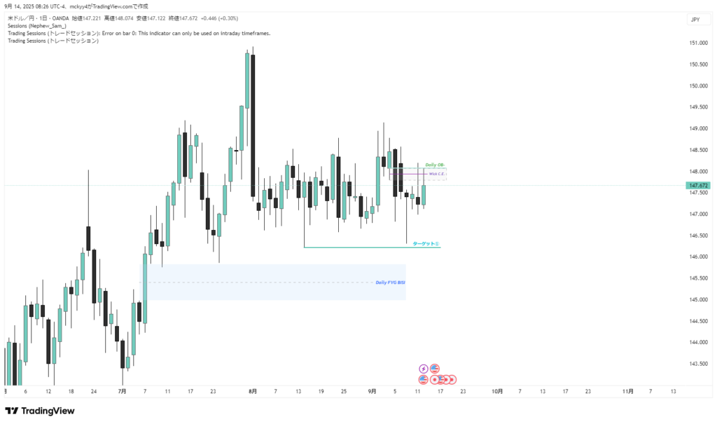 USDJPY 9/15~ USDJPY X Facebook はてブ Pocket LINE コピー 2025.09.14 ドル円相場分析やっていきます。 週足ではSLを取って反転しているBullishぽく見えますが、 日足でみるとDailyOB-が破られていないので、まだまだBearishで見ています。 ただ決め手に欠ける値動きを繰り返していますので、まだまだ積極的にショートが狙える感じではないですね。 でも目線は変わらず見ていきます。