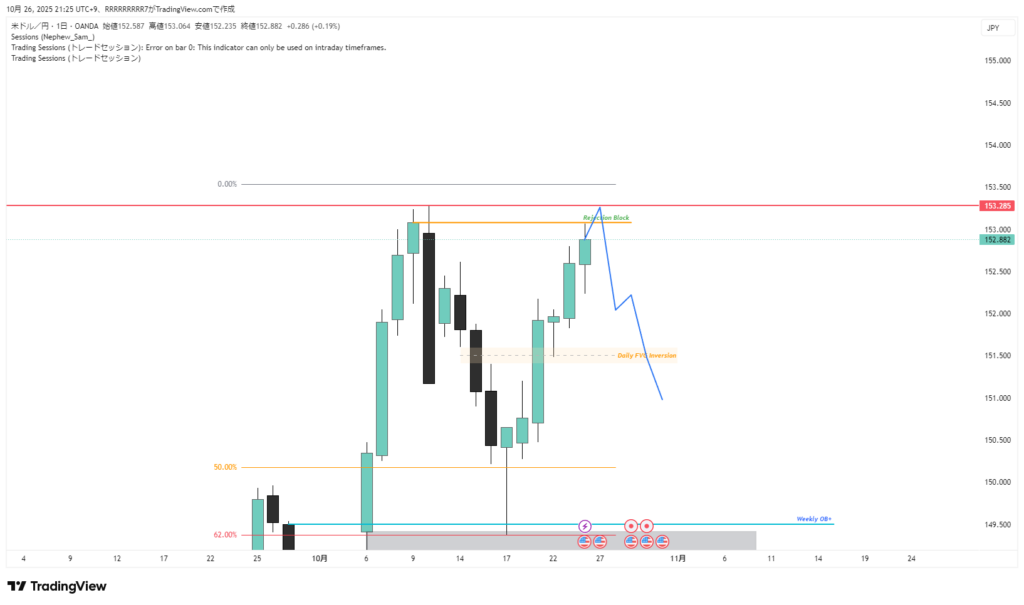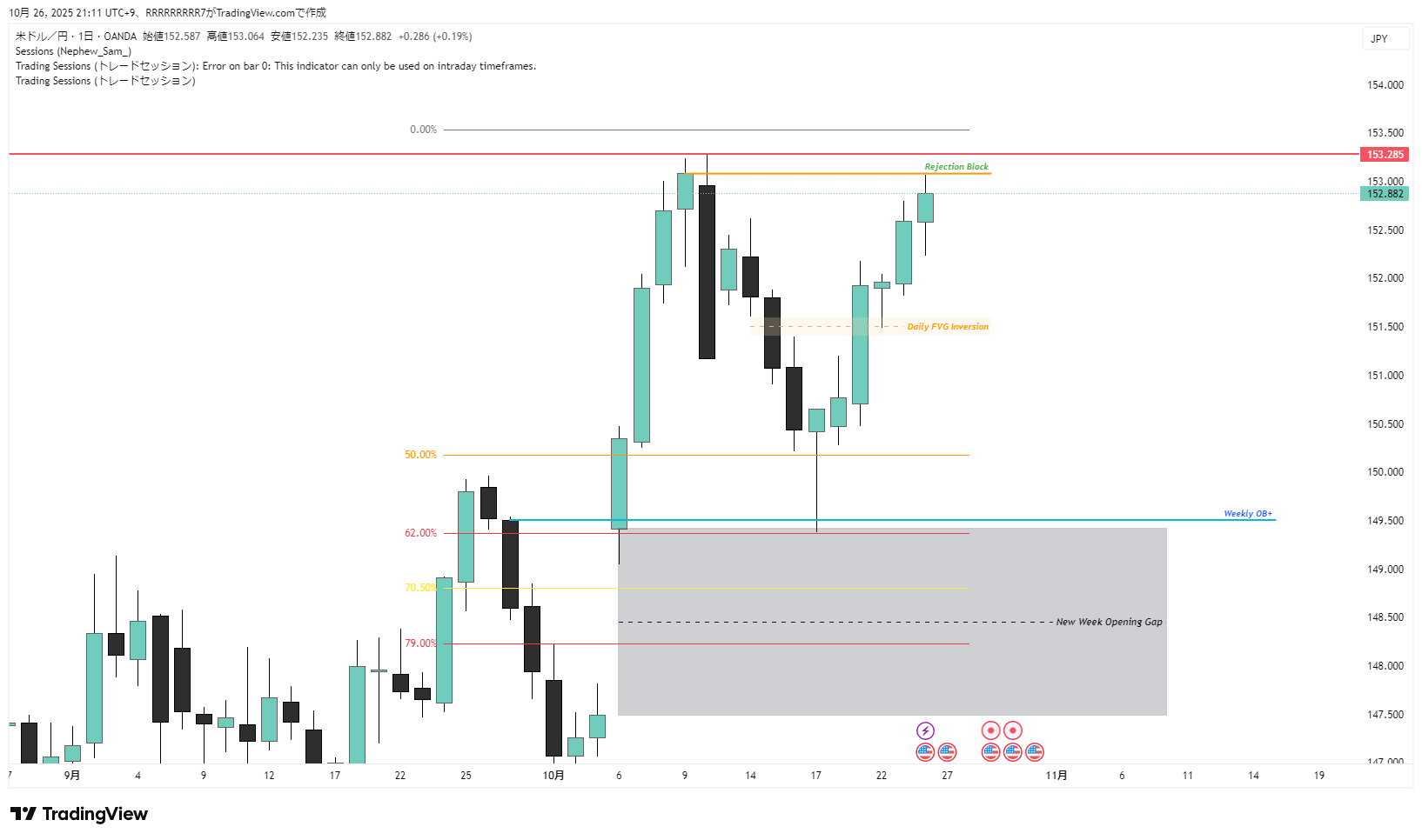 USDJPY 10/27 USDJPY X Facebook はてブ Pocket LINE コピー 2025.10.26 ドル円相場分析やっていきます。 先週の予想は外れ、反応すると考えたFVGは強く抜けてInversion FVGとなり上昇していきました。 もしRejectionBlockで反応があるならば、またNWOGまで下がってくる可能性は高くなると思います。 月曜日、火曜日あたりで方向性が出るかなーと思ってみてます。