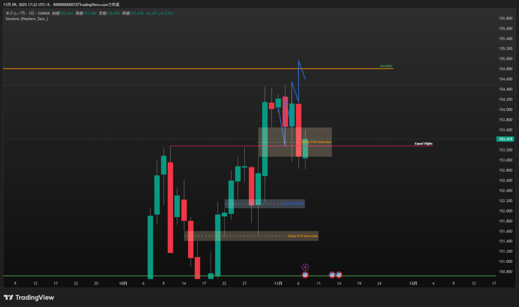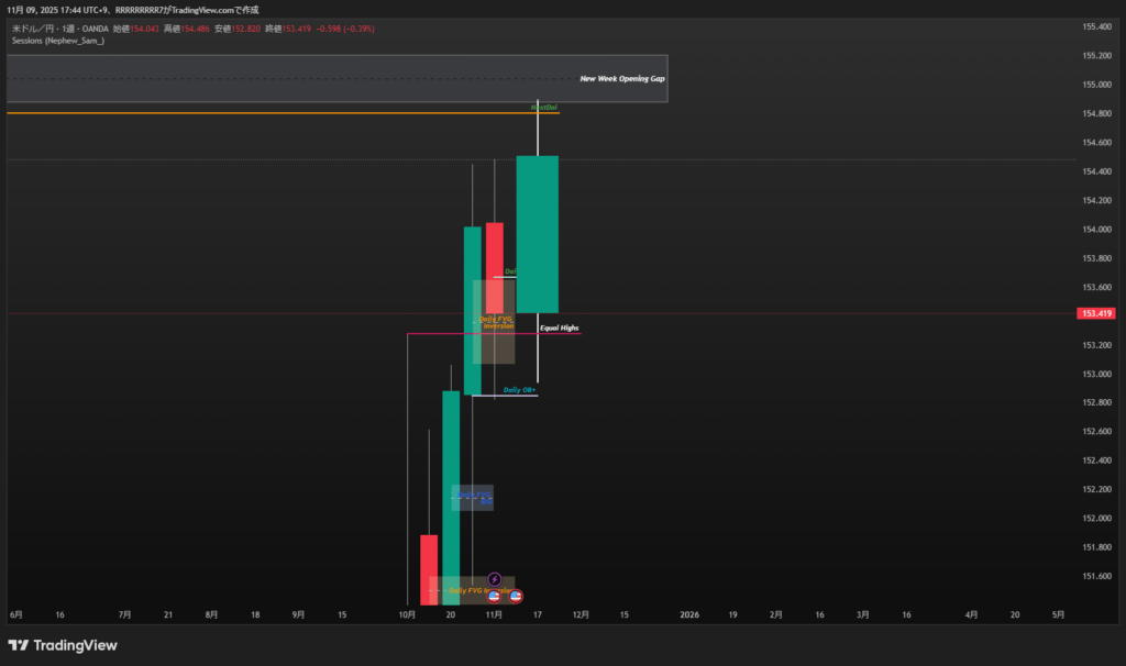 USDJPY 11/10~ USDJPY X Facebook はてブ Pocket LINE コピー 2025.11.09 今週からドル円のみの分析になります。 先週は水曜日 low of weekになるかと思いましたが、木曜日に大きく下がり、Daily FVGはInversion FVGとなりました。 Equal Highsも実体で抜けているので、下がっていく可能性が高く感じますが、 このDaily OB+に反応しているし 4時間足で見たときOTEで反応しています。 なのでこのInversionFVGはReclaimedになってまた上昇する可能性はありますね。 来週はこうなると予想します。